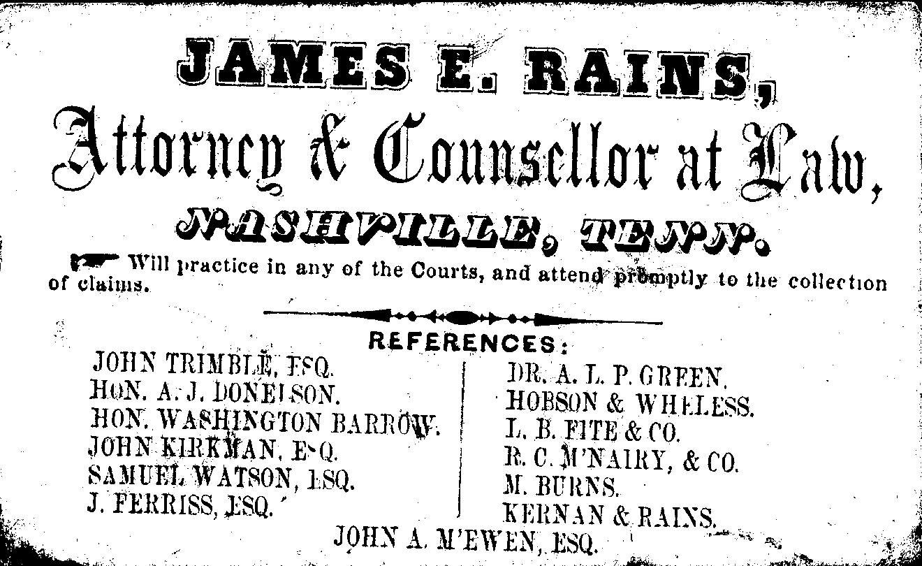 (Note, the above photo is a business card from lawyer James Rains, circa 1857. It says, “Will practice in any of the Courts, and attend promptly to the collection of claims.” It looks like he was a partner in the firm of “Kernan & Rains,” yet the card promotes Mr. Rains.)